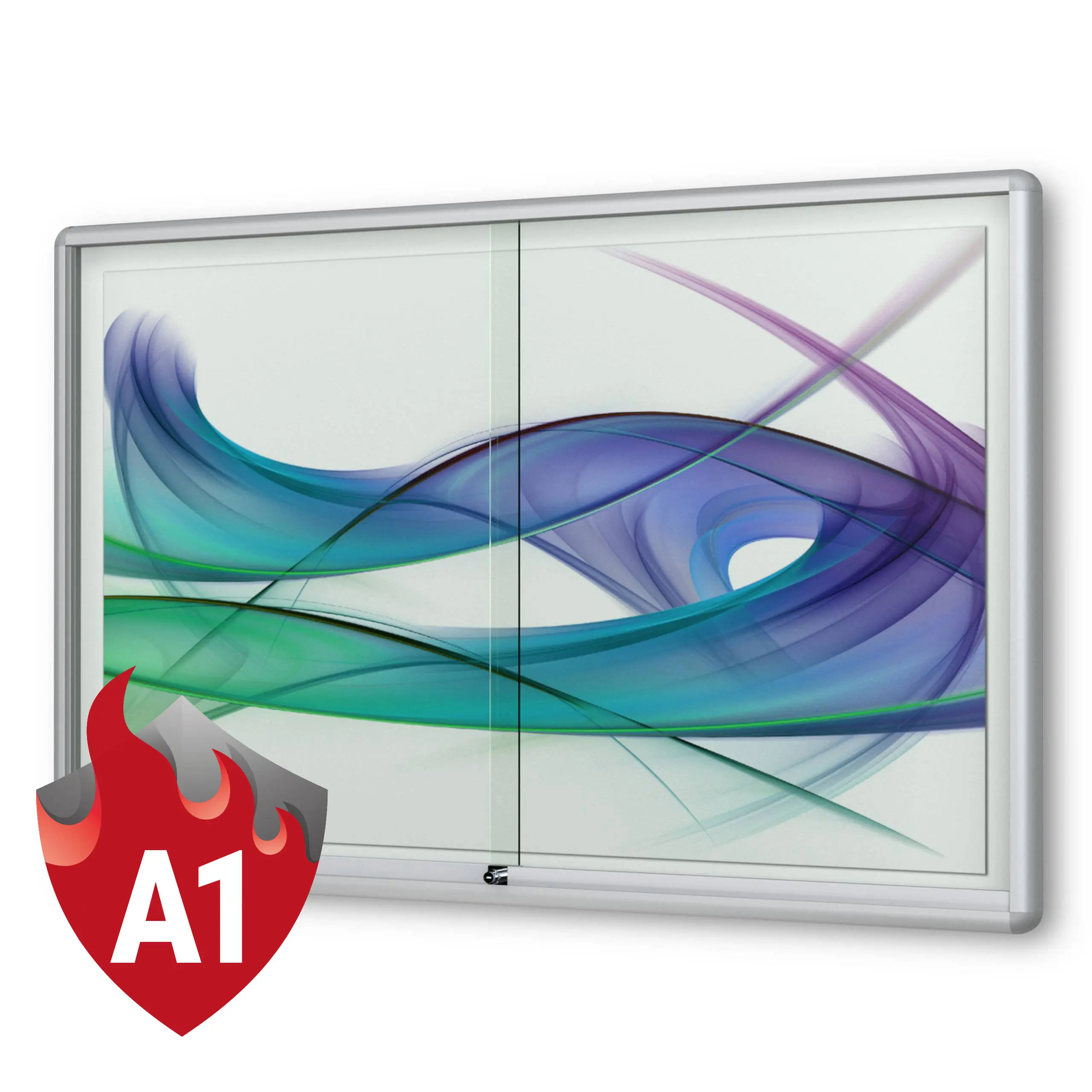 Merkmale Schaukasten: Brandschutz, Unfallschutz (gerundete Kanten), Wandmontage, abschliessbar, magnetisch, mit Schiebetüren