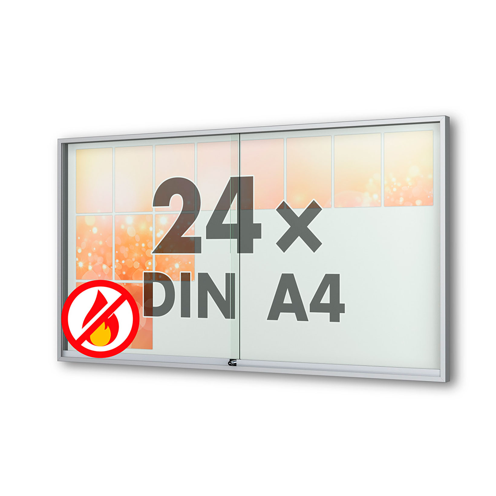Schaukasten Fortis - eckig - mit Schiebetüren -210 mm Gehäusetiefe, rollengelagerte Schiebetüren, höchster Brandschutz (A1) Größe - 18 × DIN A4 • 1370 × 1010 mmSichtfläche: 1330 x 950 mm Öffnung - rollengelagerte SchiebetürenVerglasung - Einscheiben-Sicherheitsglas / ESGOberfläche - Eloxierung in matt-silber (E6/EV1)Beleuchtung - ohne BeleuchtungSchließung - Sicherheitsschlösser mit je 2 SchlüsselnRückwand - weiße, magnethaftende Rückwand inkl. 10 Magnete